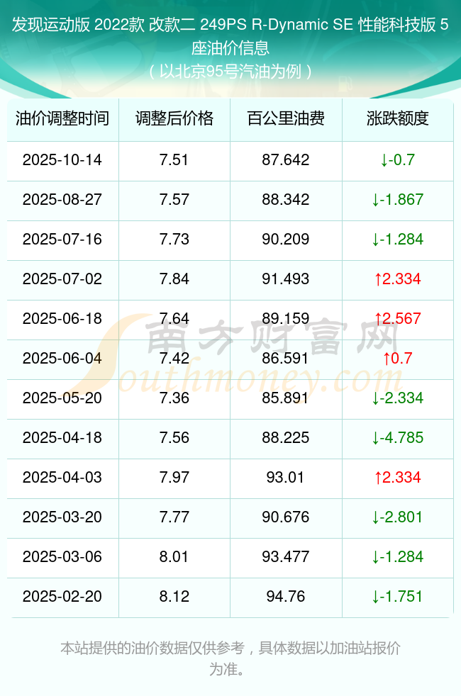依据10月14日95号汽油最新调整价格7.51元/升来核算(以北京为例),该车型每百公里的均匀油费是87.642元,上一轮8月27日调整价格7.57元每升来核算,每百公里的均匀油费是88.342元,对比上一轮少花0.7元,下一轮的油价调整时刻是10月27日24时。