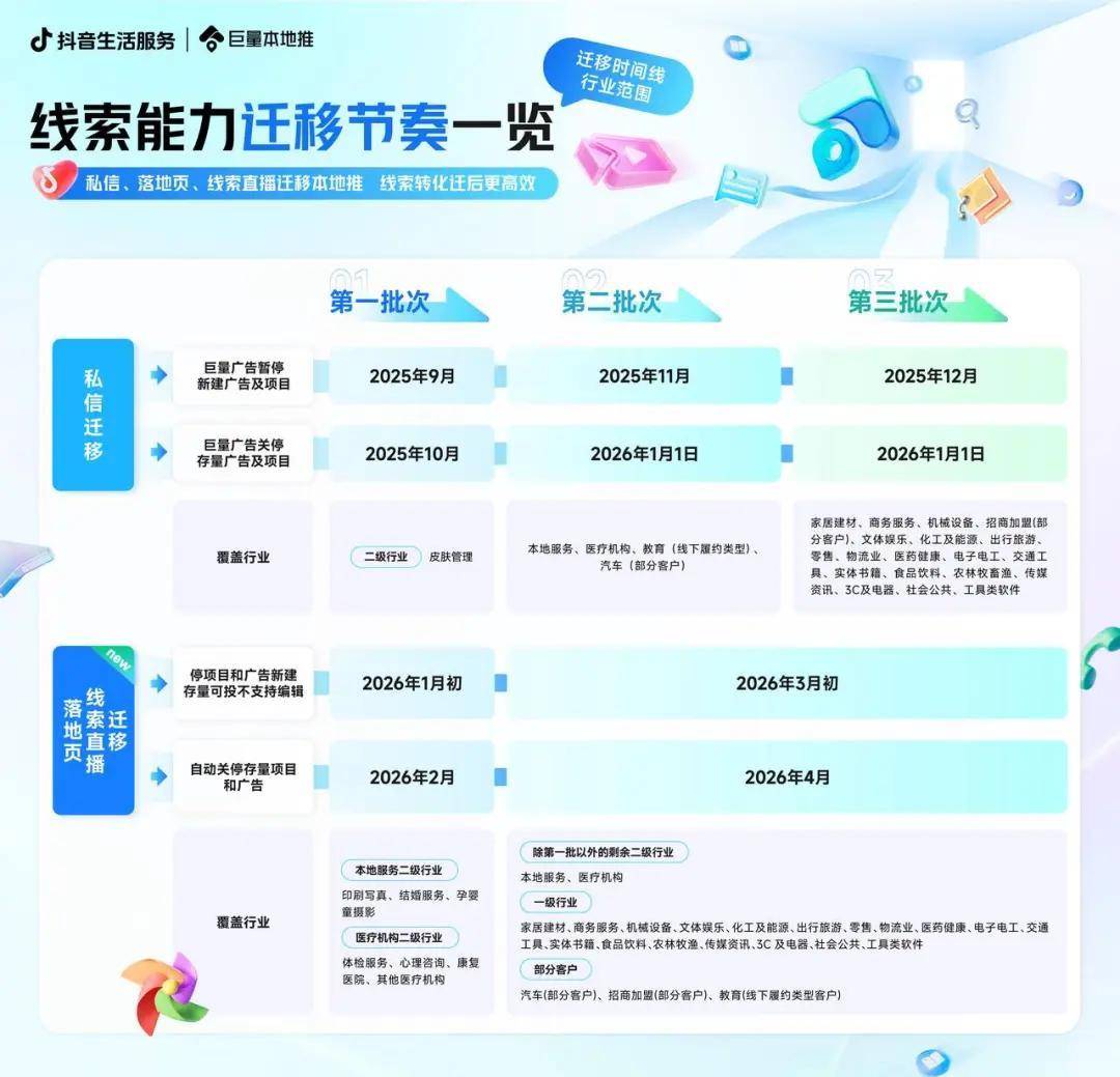 为更好的完善巨量本地推的产品生态,满足商家最新、最迫切的营销需求,平台将私信、营销页、线索直播为代表的各线索能力陆续迁移至巨量本地推,为保证存量项目正常运作,迁移动作将分多批次进行,以下为具体迁移节奏及覆盖行业范围。