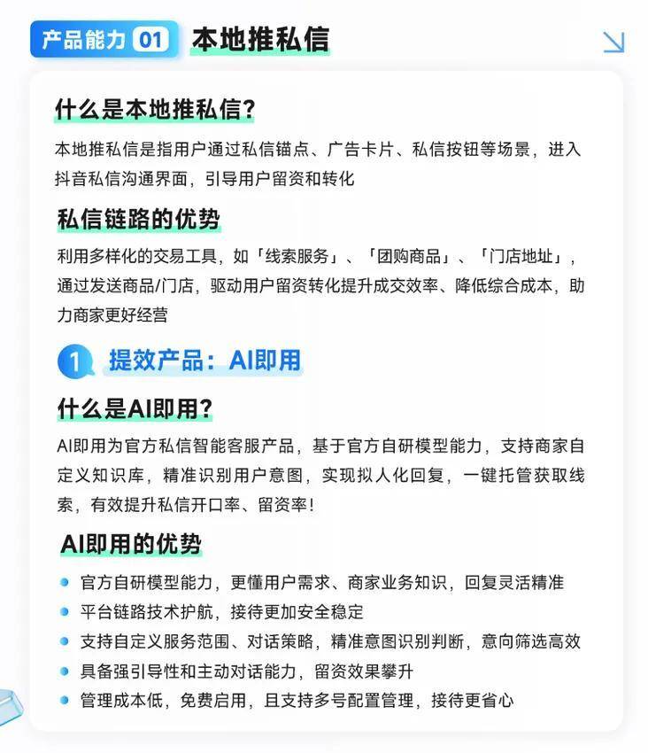 运营社了解到,无论是私信、营销页和线索直播三大链路,还是 AI 即用这种新功能,只要商家加入本地推开始使用,就能够获得流量+红包两个方面的双重激励,进一步降低入推的经营难度和成本压力,其诚意可见一斑。