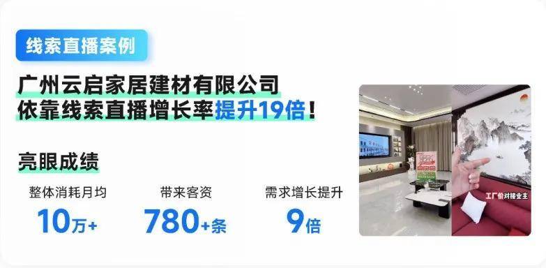 以家居行业的广州云启为例,他们原本是纯线 条短视频将用户引流直播间,依靠线%,可以说线索直播已经成为线索行业商家线上经营必不可少的阵地。